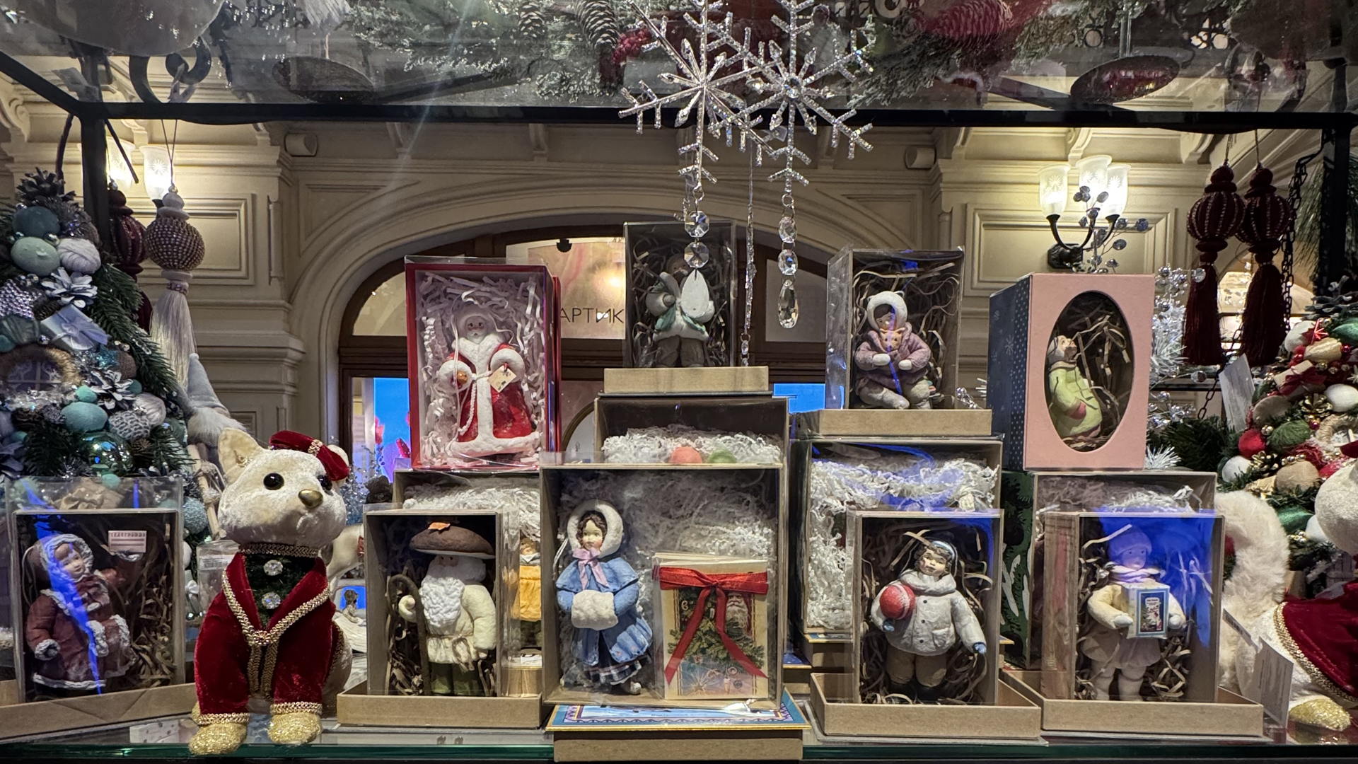 Наступила новогодняя пора и Москва преобразилась, сверкая тысячами праздничных огней иллюминации. Также и Главный универсальный магазин уже примерил новогодний наряд. В магазине снова выстроились дизайнерские елочки на красной дорожке, звучат новогодние песни, и на всех этажах парят фигурки в стиле дымковской игрушки.